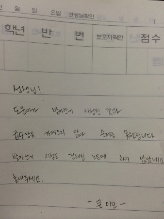 "±èµµÀ±! ¹Þ¾Æ¾²±â ³ëÆ®¿¡ ½ÃÇè ºÁ¾ßÁö ¾îµð´Ù ½ÃÇèÀ» ºÃ´Ï? Á¤ÇØÁø ³ëÆ®¿¡ Çϱⷯ ¾à¼ÓÇѰŠÀØÀº°Ì´Ï±î? ¼÷Á¦ÇÏÁö ¸»°í ¼±»ý´Ô²² ²ÙÁßµéÀ¸¼¼¿ä! À̸ð´Â ¸ð¸¨´Ï´Ù." ¶ó°í À̾߱â ÇÑ ÈÄ ¹Þ¾Æ¾²±â ³ëÆ®¿¡ ¸îÀÚ Àû¾î ¼±»ý´Ô²² º¸¿©µå¸®¶ó°í Çß½À´Ï´Ù.